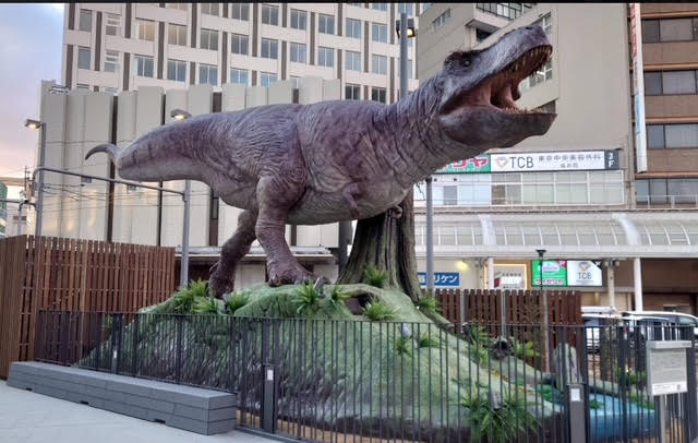 新幹線で到着。駅ビルを出て迎えてくれるのが見上げるような巨大な恐竜ティラノサウルス。